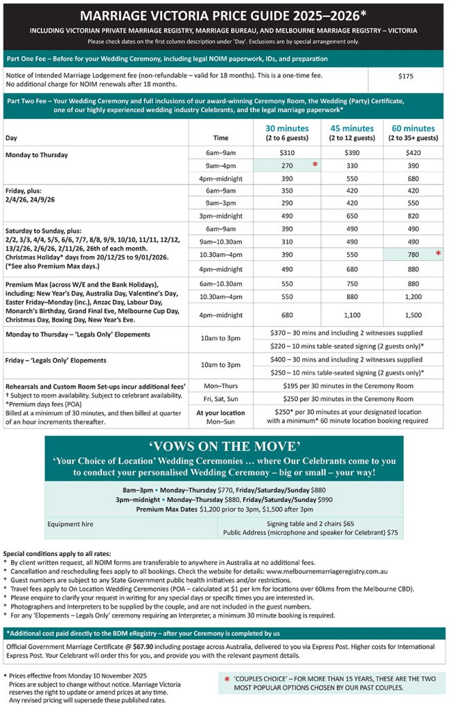 Please note – after the celebrant uploads all the legal documentation into the Government marriage portal, the final processed Marriage Certificate will be obtainable from www.bdm.vic.gov.au for the current fee of $64.40 with local Express Post delivery including. Please check their website for details.